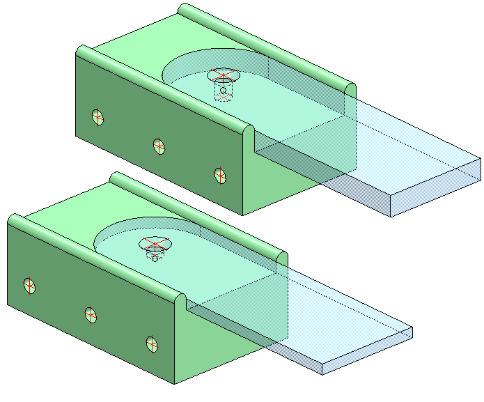 Si l’utilisation des références externes est désactivée, les fonctions associées (p. ex. Découper jusqu’à surface) peuvent quant à elles toujours être utilisées. Cependant, les modifications apportées aux références externes ne pourront plus être consignées. Si l’on reprend l’exemple du support de montage et de la languette illustré plus haut, le découpage effectué jusqu’au niveau de la surface de la languette sera bien créé, mais ne sera plus actualisé si la languette est modifiée par la suite. La référence étant toutefois enregistrée dans l’historique du Feature, vous pouvez réactiver ultérieurement l’utilisation des références externes pour cet élément.