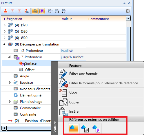 Les références externes sont signalées dans l’historique de Feature par des symboles spécifiques. Si un paramètre du Feature possède une référence externe étant utilisée, l’icône