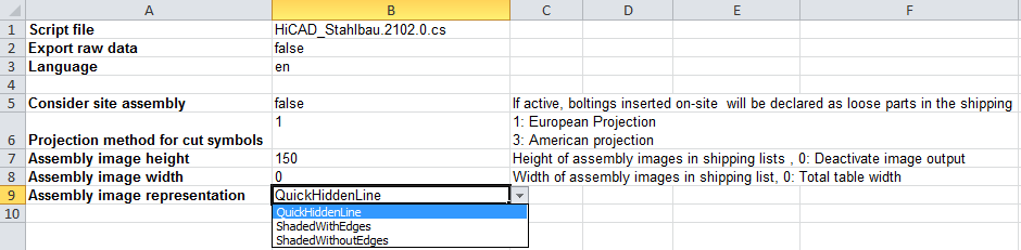 true, three additional sheets, "Header", "Quantity_List" and "Structure_List" will be generated, which will contain all data transferred by the Report Manager. This function has been especially conceived for error detection. true , boltings that have been marked as site assembly boltings will be listed as loose parts in the shipping list. 1, the "European" or "German projection" will be used for cut symbols (view from right). If this value is set to 3, the "American projection" will be used (view from left). 0, no images will be created in the shipping list. 0 is entered here, the output of the image will be determined by the total table width. QuickHiddenLine ShadedWithEdges ShadedWithoutEdges For image creation HiCAD must be running during Excel output via the Report Manager, and the corresponding drawing must be open.If a different drawing is open, to image will be created.