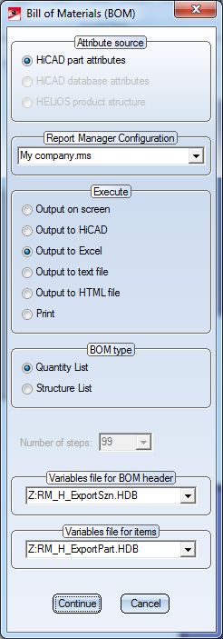 To save these settings, select File > Settings > Save as in the Report Manager and save the settings to the HiCAD sys directory, e.g. as "My company.rms". When you now select Itemisation/Detailing > BOM in HiCAD you can choose the newly generated .rms file beneath Report Manager Configuration in the Bill of Materials (BOM) window, or, if the file is not offered there, just enter the file name manually.