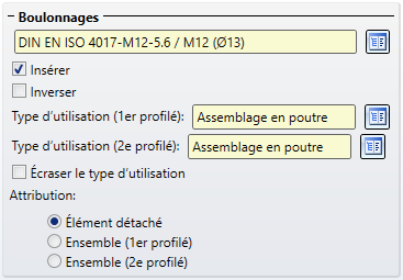 Si c'est la case Élément détaché qui est cochée, les groupes de boulonnages Boulonnage seront alors insérés comme ensembles individuels au même niveau que les ensembles du 1er/2e profilé.