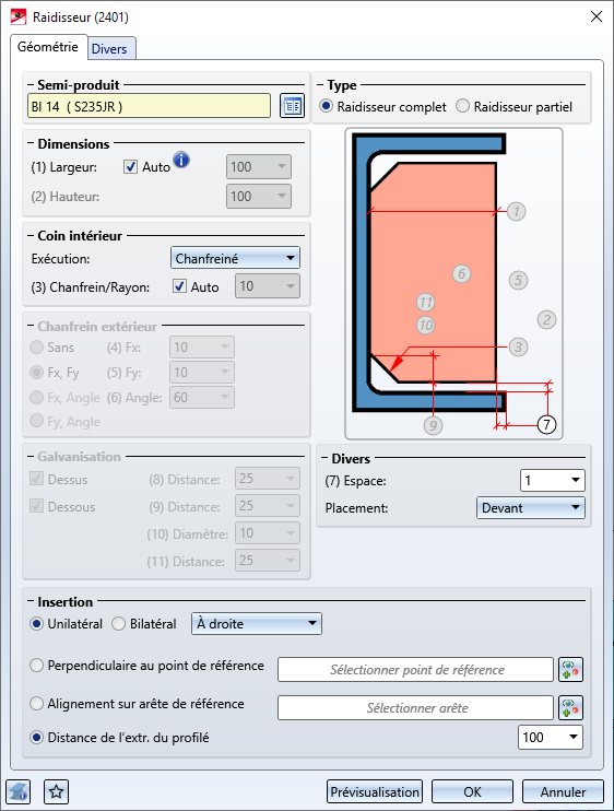 Vous déterminez ici l'exécution du raidisseur. Sont possibles :
