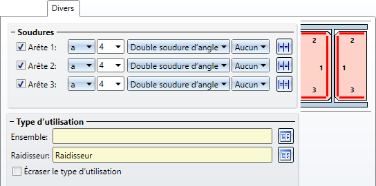 Vous pouvez attribuer ici un type d'utilisation à l'Ensemble du profilé sélectionné et au Raidisseur. Si une utilisation a déjà été attribuée à l'ensemble du profilé, la case Écraser le type d'utilisation peut être utilisée pour spécifier si l'utilisation existante doit être conservée ou si elle doit être remplacée par le type d'utilisation sélectionné dans l'onglet Divers.