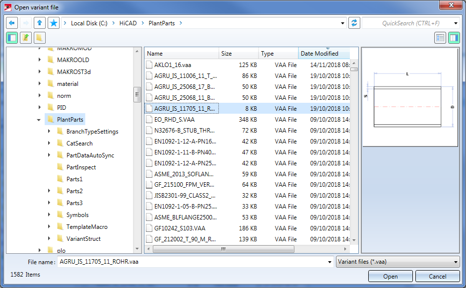 An extensive description of the Open variant file dialogue window can be found in the Dialogue for Opening and Saving of Files topic of the HiCAD Basics Help.