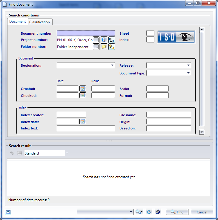You can also select an archive file (VAA) via HELiOS. For example, select with DB, via document master or with DB, via article master option from the File selection list box and click Open or Derive new. The HELiOS search mask will be displayed. The selected archive file can also be located in the Vault Server, provided that the server is active.