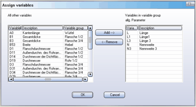 The list to the right contains variables belonging to the selected variable. The left list contains all other variables belonging to the part. This list is initially empty as the group General parameter was assigned to all variables.