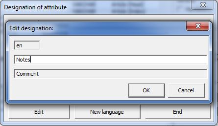 The original, predefined value will be preserved in the system. After a new editing of the attribute designation, where the corresponding row ("Notes") will be cleared by marking the entry, pressing the DEL key and confirming with OK, the original entry "Comment" will be reappear.