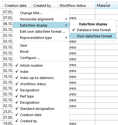 For example, in result lists you can switch from Database time format (this is the above-mentioned database setting) to Own time format via the context menu of the right mouse button on the header of date fields under the menu item Time display.