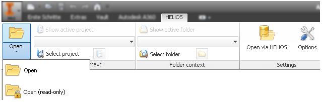 After successful installation of the HELiOS <-> Inventor interface, the HELiOS menu will appear on the Inventor Ribbon bar, containing the function groups Project context / Folder context and Settings.