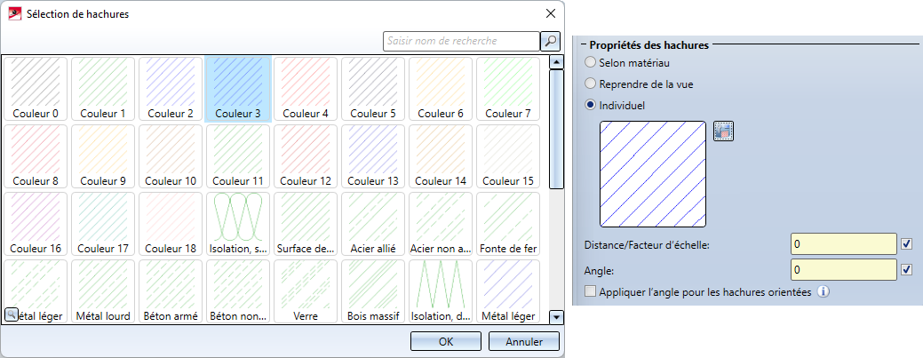 , les paramètres de l’élément existant, c'est à dire les paramètres que vous avez attribués avec la fonction Hachures dans la vue de coupe ou de la coupe partielle, seront appliqués comme paramètres dans la fenêtre de dialogue. Vous pouvez ensuite continuer dans la fenêtre de dialogue.