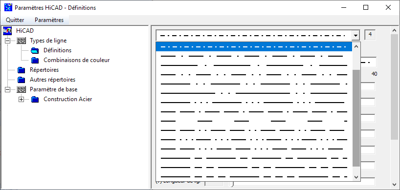 Dans le sous-dossier Définitions, vous pouvez modifier les types de ligne. Cela détermine la représentation des lignes et des arêtes, par ex. en continu, en pointillé, mixtes, etc. Neuf types de ligne différents sont prédéfinis dans HiCAD et peuvent, à l'exception des types 1 à 4, modifiés.