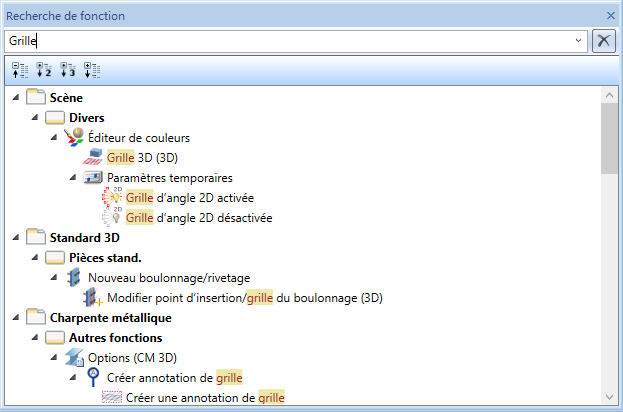 HiCAD offre désormais une large gamme de fonctions. Il peut alors vous arriver de connaître l'existence d'une fonction, sans trop savoir exactement dans quel onglet elle se trouve. Dans ce cas, la nouvelle fenêtre d'ancrage Recherche de fonction vous sera d'une grande utilité.