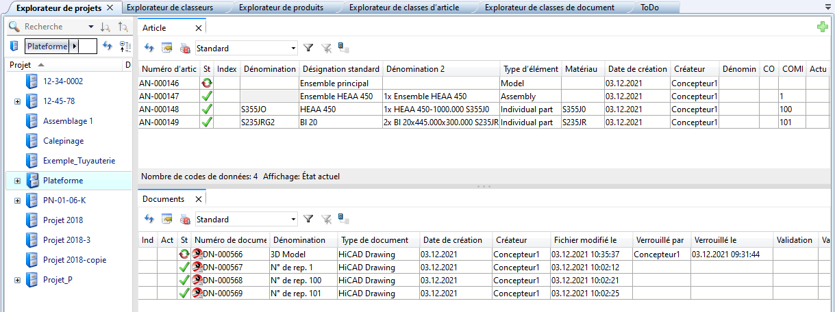 Après avoir créé tous les dessins et leur validation, le projet contient en supplément les fiches d'article et de document des dessins de fabrication.