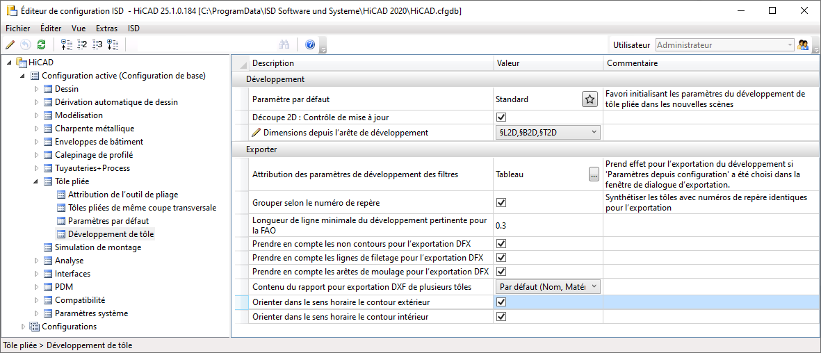 L'orientation des polylignes fermées est ajustable pour l'exportation des projections développée de tôle. Dans le Gestionnaire de Configuration, vous pouvez choisir pour le contour intérieur et extérieur sous Tôle pliée > Développement de tôle le sens horaire ou non.