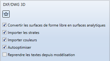 Dans la partie droite de la fenêtre de dialogue, vous pouvez procéder à différents paramétrages pour votre importation. Ces paramètres peuvent être prédéfinis dans le Gestionnaire de Configuration sous Interfaces > Interfaces 3D générales.