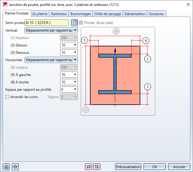La fenêtre de dialogue Jonction de poutre, profilé sur âme, avec 2 platines et raidisseur (1211) s'ouvre.