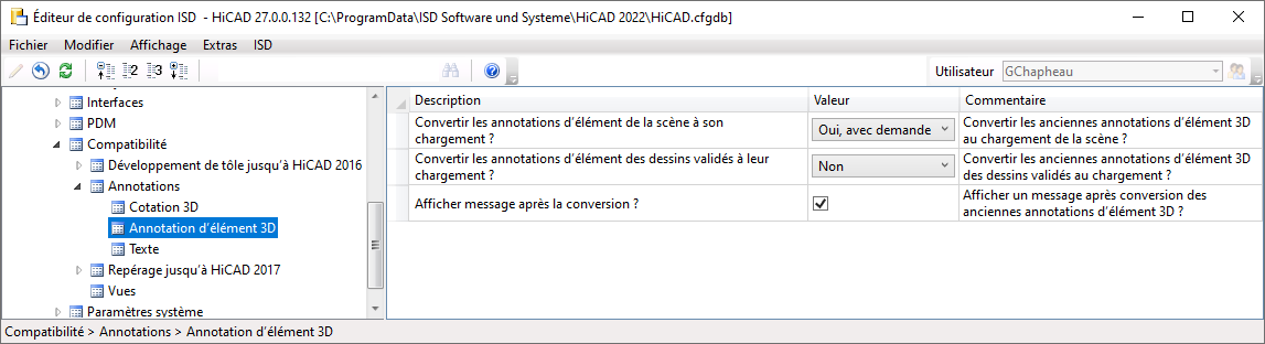Les paramètres par défaut peuvent être définis depuis le gestionnaire de configuration en accédant à Compatibilité > Annotations > Cotation 3D. Vous pouvez y définir la procédure à suivre lorsque des scènes contenant des bulles d’annotation sont chargées, ou choisir si un message de confirmation doit être affiché après la conversion.