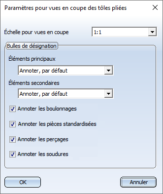 Dans cette fenêtre de dialogue, vous spécifiez les paramètres pour les vues en coupe des tôles pliées.