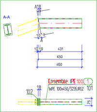 Pour les éléments détachés, par exemple les tôles soudées sur tranche, la vue en coupe correspondante peut être créée automatiquement. La direction d'observation de la vue en coupe va du centre du profilé à la plaque fixée. La ligne de coupe de la vue en coupe est créée parallèlement à la plaque attachée. La distance par rapport à l'élément de jonction peut être spécifiée dans le champ de saisie Distance du plan de coupe.