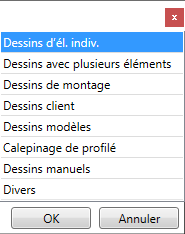 Lors de l'enregistrement de dessins créés via la Gestion de dessin, vous avez la possibilité d'exécuter un script individuel pour la retouche automatique. À cette fin, le paramètre Retouche du dessin est présent. Vous pouvez y choisir entre les dessins d'élément individuel, les dessins contenant plusieurs éléments, les dessins de montage, les dessins du client et divers. Par Divers, on entend toutes les scènes HiCAD qui ne sont pas conformes aux autres classifications, comme les modélisations 3D, les fichiers créés avec la fonction Référencer l’élément, Enregistrer, Dessin d’élément individuel, etc.