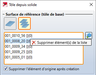 L'option Supprimer l'élément d'origine supprime l'élément 3D dès que la tôle en a été construite. Dans l'ICN, la référence de l'élément 3D sera aussi supprimée.