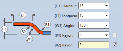 Si cette icône est activée, vous pouvez alors paramétrer le pli en Z en saisissant la longueur et la hauteur. Les rayons sont, dans le cadre de cet exemple, repris du produit semi-fini. Décochez la case