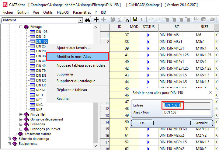 Le premier paramètre est le nom interne de la table du catalogue devant être parcourue. Pour l'obtenir, faites un clic droit dans l’éditeur de catalogue sur la table souhaitée, puis cliquez sur la ligne Modifier le nom Alias du menu contextuel. Le nom interne de la table se trouve dans le champ Entrée de la boîte de dialogue. Vous pouvez ensuite fermer cette fenêtre en cliquant sur le bouton Annuler.