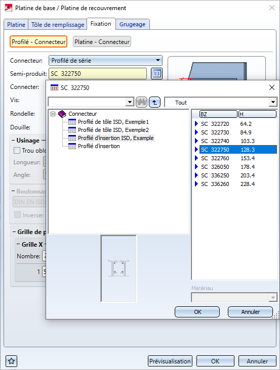 Concernant le Connecteur et le Semi-produit, il s'agit du profilé de connexion qui aura été choisi sous Profilé - Connecteur et qui est connecté avec le profilé. Celui-ci peut être sélectionné ou modifié à ces deux endroits de la fenêtre de dialogue.