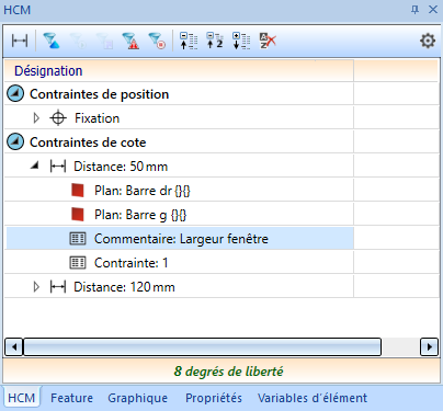 L'onglet HCM vous offre également un bon aperçu des contraintes de position et de cote. Pour les ensembles, le degré de liberté restant est également indiqué.
