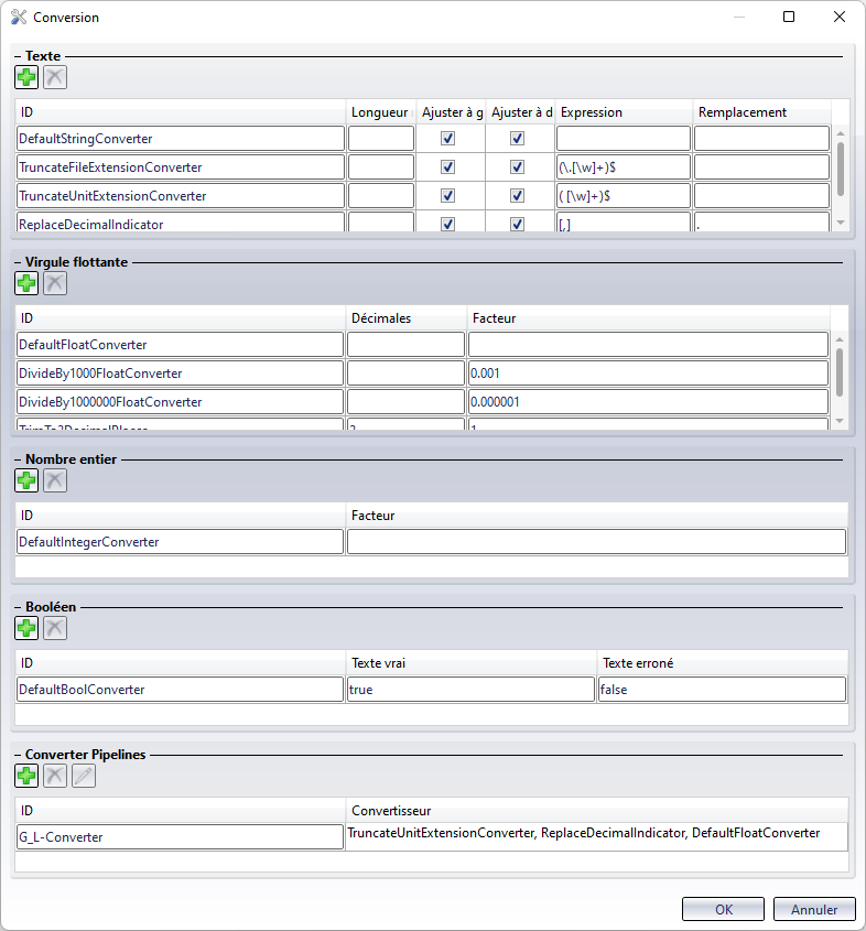 Dans l'image ci-dessus, vous voyez par exemple le convertisseur "ReplaceDecimalIndicator". Sous Expression, une virgule est indiquée entre crochets, sous Remplacement, un point. Si ce convertisseur est utilisé, il remplace chaque virgule d'une chaîne de caractères par une virgule lors de la conversion.