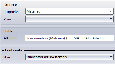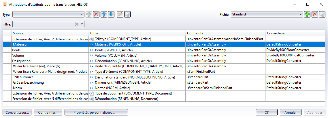 Un mapping entre l'attribut source Matériau et l'attribut cible Matériau est déjà configuré par défaut dans les Attributions d'attributs pour le transfert vers HELiOS.