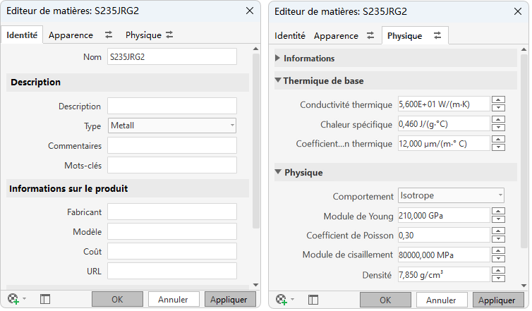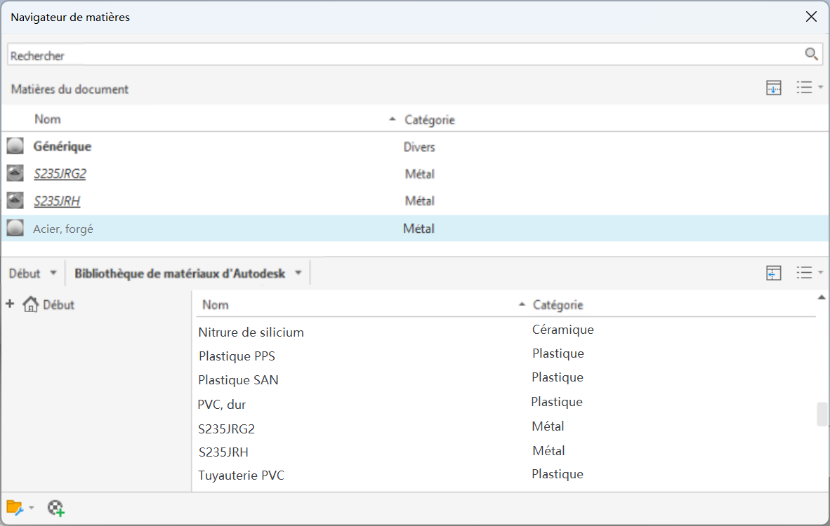 À titre d'exemple, deux matériaux de document ("S235JRG2" et "S235JRH") ont été créés dans le navigateur de matières d'Inventor et ajoutés à la bibliothèque des matières d'Inventor.
