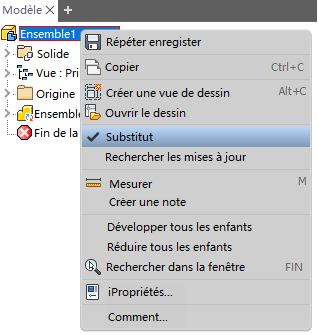 Dans la représentation de la structure (arborescence de modèle dans le langage Inventor), les substituts sont signalés par l'icône