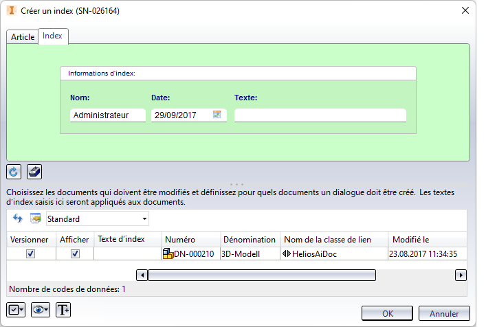 Ensuite, la fenêtre Créer un index s'ouvre encore pour le Document lié avec lequel le processus est répété (si Afficher est actif pour le document).