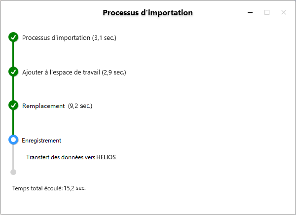 Comme pour le transfert de la CAO vers HELiOS à l'aide de la fenêtre de saisie Nouveau dans HELiOS, vous voyez également une barre de progression du processus d'indexation, qui vous informe de l'état des différentes étapes du processus.