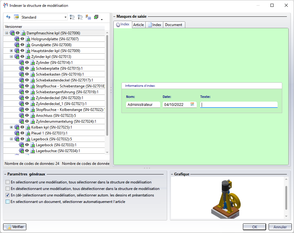La fonction Indexer la structure de modélisation (l'arborescence de modèle dans le langage Inventor) permet de créer la preuve d'une modification pour un document basée sur la structure de modélisation CAO.