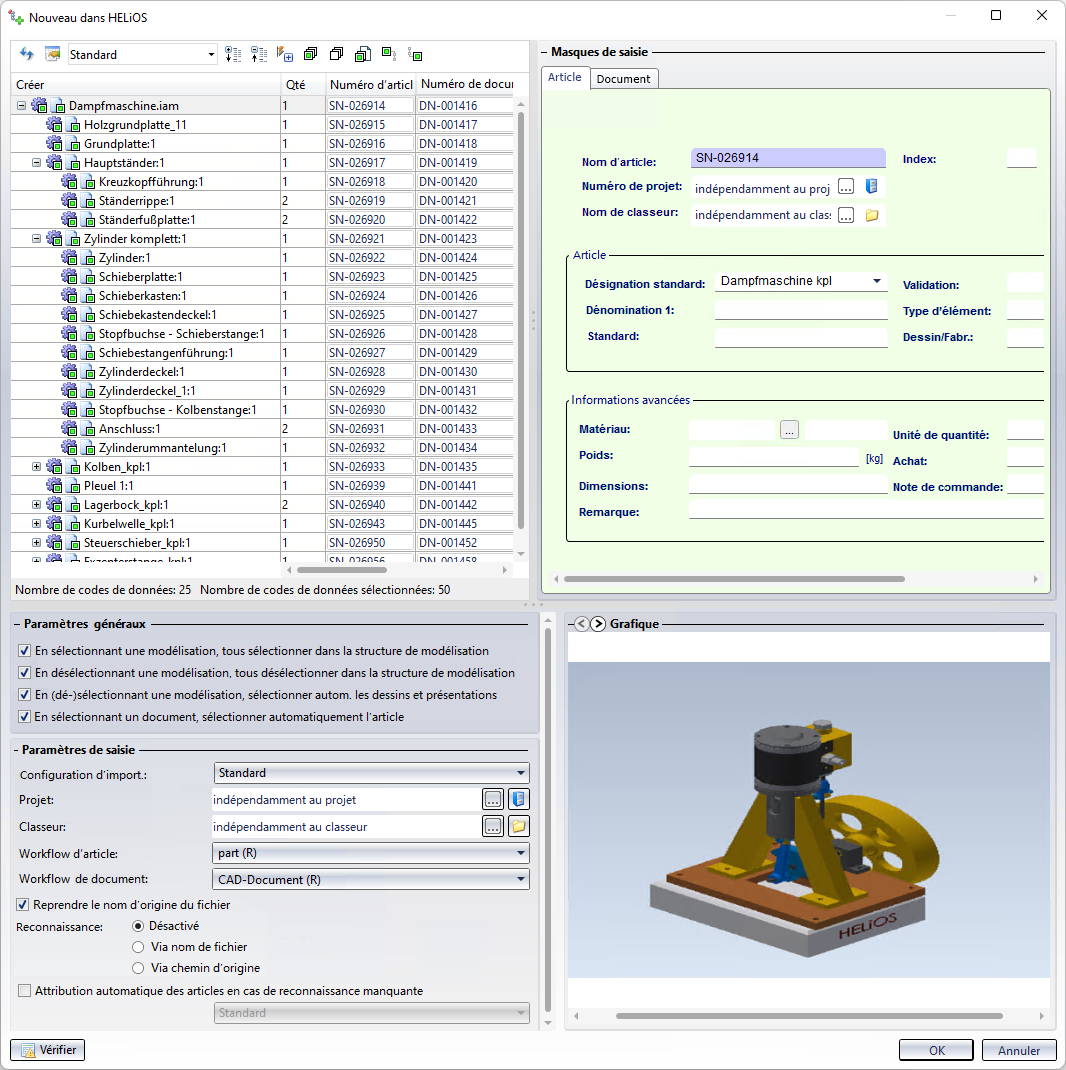 Pour le transfert de la structure de modélisation CAO (l'arborescence de modèle dans le langage Inventor) vers la base de données HELiOS, vous disposez de la fonction