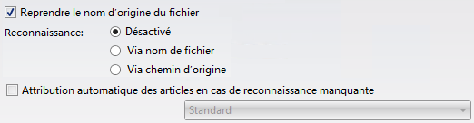 L’option Reprendre le nom d'origine du fichier joue un rôle important dans ce cas de figure, car elle empêche HELiOS de générer automatiquement des noms de fichiers trop complexes et peu pratiques d’utilisation. Les fichiers ne peuvent être reconnus selon leur nom qu’à l’aide de cette option. - Via chemin d'origine : le chemin d'accès du fichier d’origine complet des données transférées est enregistré dans HELiOS. Lorsque cette option est activée, HELiOS recherchera les documents partageant le même chemin d’accès.