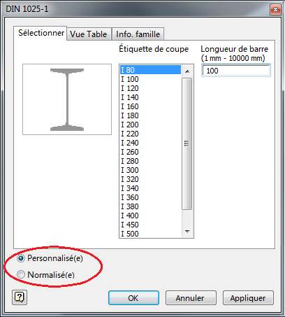 Pour les profilés du centre de contenu Inventor qui ont été déclarés comme Personnalisé(e) dans la conception (par opposition à comme Normalisé(e)), une fiche d'article distincte est créée à chaque fois.