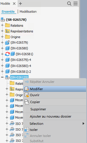 Toutefois, si le sous-ensemble SN-026125 a été placé en mode Modifier dans Inventor via clic droit > Modifier comme illustré ci-dessus, l'ensemble placé à partir du presse-papiers sera inséré en dessous de celui-ci tant que le mode Modifier sera actif.