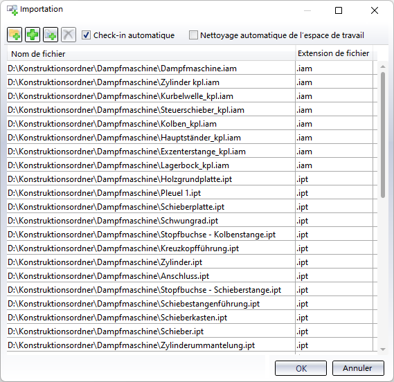 Confirmez avec OK. Tous les fichiers .ipt et .iam qui se trouvent dans ce répertoire sont alors listés dans la fenêtre d'importation.