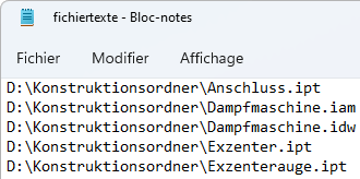 À savoir : Le contenu du fichier texte est d'abord transféré sans autre contrôle. Cela signifie que, dans certaines circonstances, les chemins d'accès aux fichiers sont transférés dans la fenêtre d'importation, même s'ils contiennent plusieurs références aux mêmes fichiers ou s'ils renvoient à des chemins d'accès qui n'existent pas. Les éventuelles anomalies sont affichées dans le protocole d'erreurs (InventorImportResult.log) après le processus d'importation.