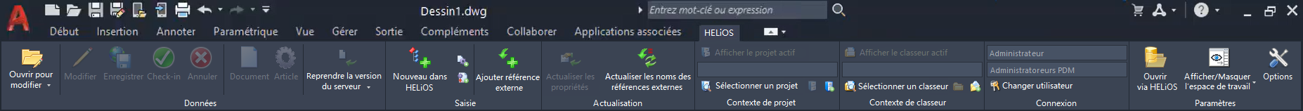 Une fois le couplage HELiOS/AutoCAD installé, la barre de menu HELiOS sera ajoutée au ruban AutoCAD.