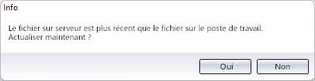 Le système vérifie si la version du document chargé ou du document actif correspond bien à celle enregistrée sur le serveur. Si ce n’est pas le cas, par exemple parce que le document a été enregistré à un endroit différent, relié à un nouvel index, ou encore parce que les données de fiche d’un article ont été modifiées ou reliées à un nouvel index, alors cette fonction permettra de transférer la version la plus récente depuis le serveur. Une boîte de dialogue apparaîtra à l’écran.