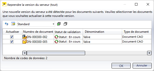 Si la version de ces documents enregistrée sur le serveur est plus récente que la version actuelle - par exemple parce que le document a été enregistré par un utilisateur différent entre-temps, qu’elle existe sous un index plus récent, que les données de référence d’un article associé ont été modifiées ou que l’article existe sous un nouvel index-, alors une fenêtre de sélection recensant tous les documents possédant une version plus récente apparaîtra à l’écran :