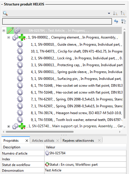 Les articles nouvellement ajoutés sont caractérisés par un . Les nouveaux articles synchronisés de la CAO vers HELiOS et synchronisés à l’aide de la fonction Transférer la structure produit à un niveau du CAO vers HELiOS sont caractérisés dans la fenêtre de droite par un .