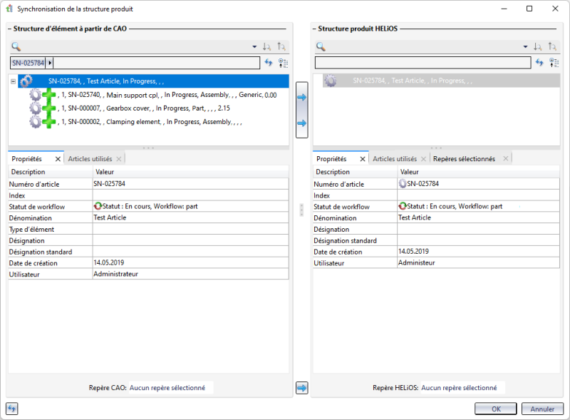 Une fois la fonction exécutée, une fenêtre apparaît à l’écran : à gauche, la structure de l’élément dans le logiciel CAO, et à droite, la structure produit dans HELiOS. Durant la synchronisation de la structure produit, le système vérifiera entre autres s’il existe de nouvelles versions des articles associés aux repérages PDM. Une fois la synchronisation réalisée, les modifications effectuées sont caractérisées comme suit :