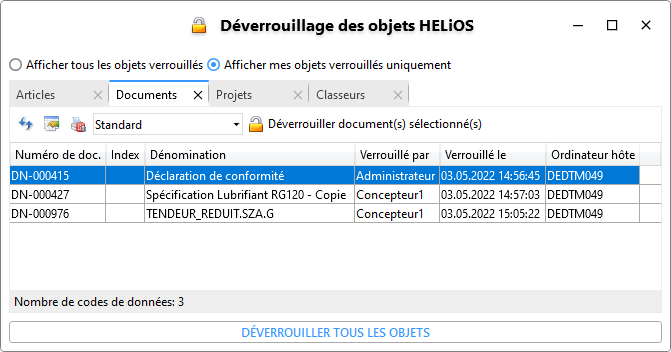 - Afficher tous les objets verrouillés: tous les objets actuellement verrouillés dans HELiOS sont répertoriés (indépendamment de l'utilisateur) dans l'onglet de l'objet correspondant (Articles, Documents, Projets ou Classeurs).