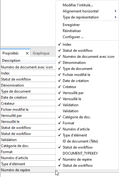 Tous les attributs du menu contextuel qui sont cochés s'affichent dans la fenêtre des propriétés. Cliquez pour ajouter ou supprimer les coches. Sélectionnez Configurer ... pour ouvrir une fenêtre de dialogue de sélection qui fonctionne de la même manière que la fenêtre de dialogue de la Configuration des listes des résultats.