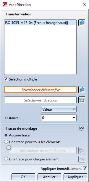 Si la case Appliquer immédiatement est cochée, la transformation sera immédiatement acceptée - comme indiqué dans l'aperçu - et entrée dans le protocole de l'éclaté, c'est-à-dire que vous n'avez pas à cliquer sur le bouton Appliquer. Si d'autres éléments sont sélectionnés immédiatement après - sans modifier les autres paramètres - la même transformation est effectuée immédiatement pour ces éléments sans que ceux-ci n'apparaissent dans la liste de sélection.